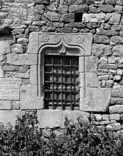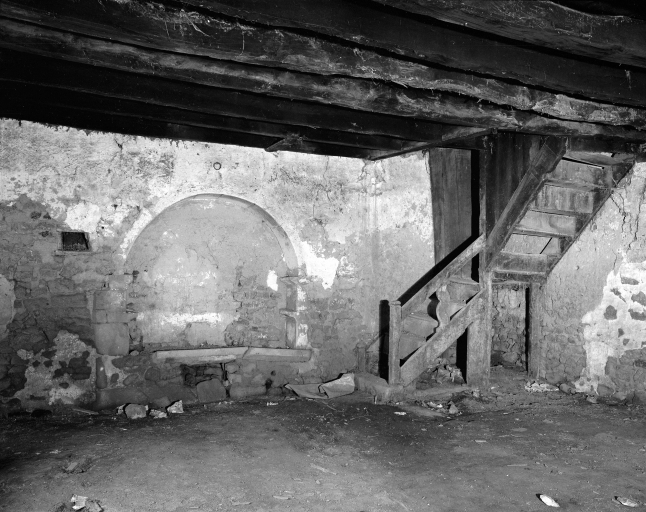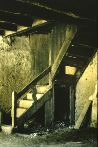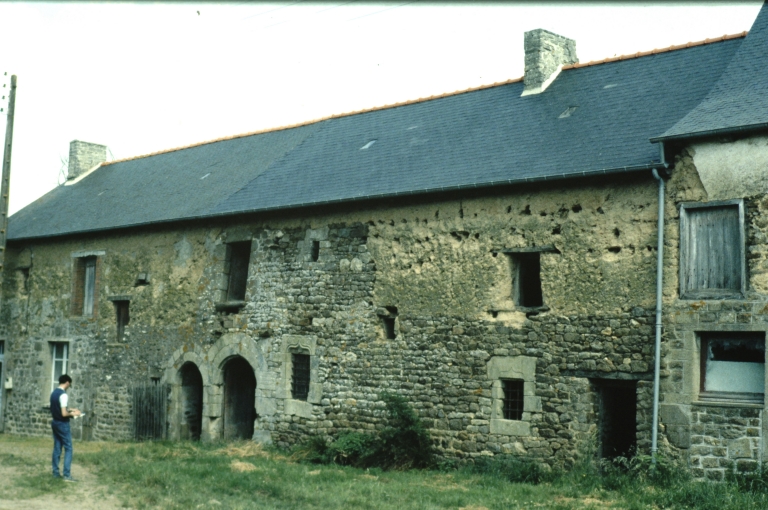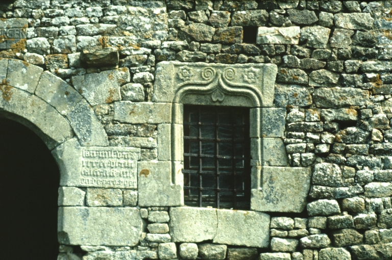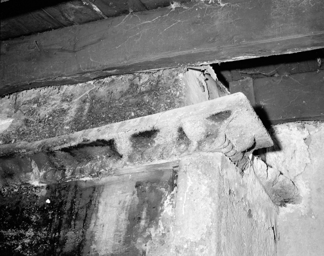 Logis 2e quart 16e siècle détail (date 1536 par inscription : LAN : MIL : V : CES/RTR : ET : VI : FUT/FAITE : CETE : ME (S ?) ON : DE : P : RO : VGER) ; remanié en 1677, date portée ; date 1589 sur logis voisin à l'ouest remanié.