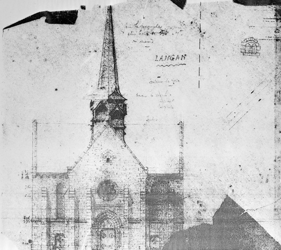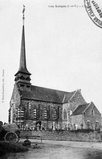 L'église de Langan fut construite à la fin du 19e siècle par l'architecte rennais Arthur Regnault à la place de l'ancienne église. La construction a commencé par l'élévation de la nef et du clocher entre 1878 et 1880. Ce clocher s'était partiellement écroulé en 1876. C'est seulement entre 1894 et 1896 que le transept, le chœur et la sacristie ont été édifiés. Cette construction en deux campagnes s'explique par des raisons financières mais n'empêche pas d'avoir un édifice relativement original.