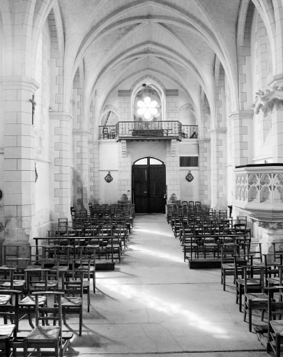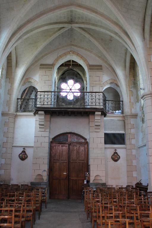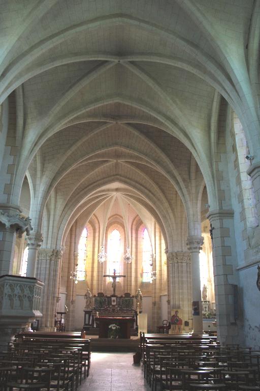 La première travée abrite une tribune qui donne accès au clocher et est suivie par trois autres travées couvertes chacune par une voûte quadripartite dont les voussures reposent sur des piles simples. Au nord de la nef se trouve une chaire en pierre.