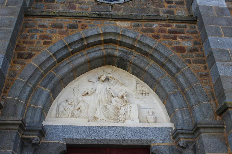 L'accès au bras sud du transept se fait par une porte qui est un remploi de l'ancienne église du 15e-16e siècle. Cette porte de style gothique flamboyant est encadrée par deux tores ainsi qu'un lion, le deuxième ayant disparu dans le mur de la nef. De plus, elle est surmontée d'une archivolte en forme d'accolade avec des décors perlés et des choux frisés. Ce même bras est éclairé à l'ouest par une baie gothique à double lancette surmontées d'une rosace simple et une meurtrière sur la façade sud du transept, sur cette même façade prend appui une sacristie avec trois baies et une porte d'accès. Sur son mur est la corniche en calcaire serait un remploi.