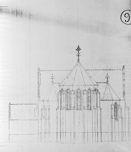 Le chevet de l'église suit le même rythme que la nef avec une alternance de baies brisées et contreforts.