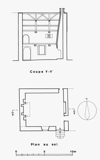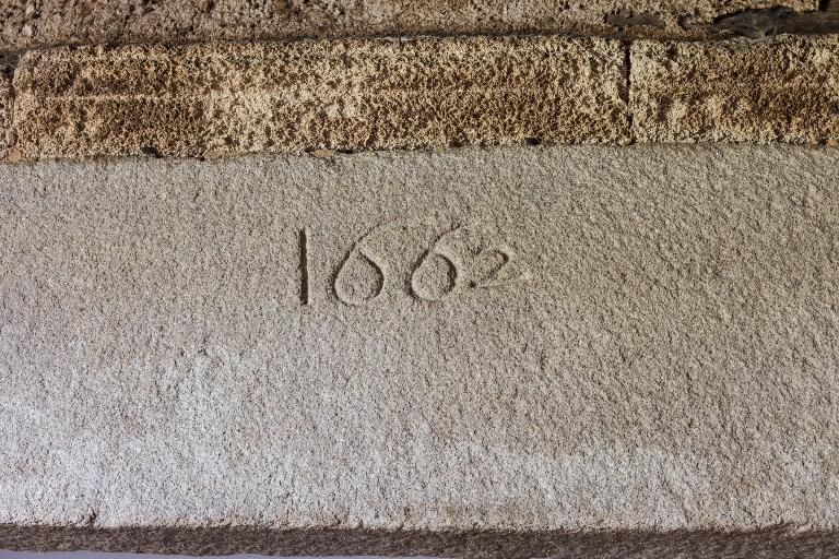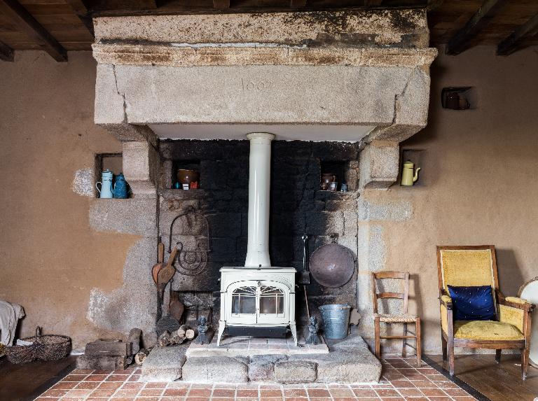 Situé en écart par rapport à la voie et bâti sur un plan carré, cet ancien corps de ferme de la fin 17e siècle se compose d’un rez-de-chaussée, d’un étage et de comble. Elle est construite en beauge (terre), en pierre de taille et moellon de granite ainsi qu’en calcaire. La façade principale, orientée sud, est percée par sept ouvertures : trois en rez-de-chaussée dont une fenêtre rectangulaire, une porte avec un linteau formant un arc en plein cintre et une porte rectangulaire ; trois à l’étage dont un jour doté de grille, une gerbière à arc en plein cintre et une gerbière rectangulaire ; une petite lucarne au niveau des combles. La partie nord du bâtiment comporte une corniche à modillons en pierre calcaire. Le toit est à longs pans avec pignon couvert et sa couverture est en ardoises fixées aux crochet ; le faîtage est constitué de tuiles à crête en embarrure. Le pignon ouest soutient une souche de cheminée en pierres de taille de granite sur laquelle on observe la date portée de 1662. À l’intérieur se trouve un escalier, une armoire mural (vaisselier sans évier) et une cheminée monumentale.