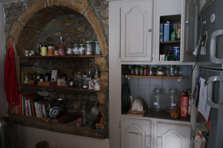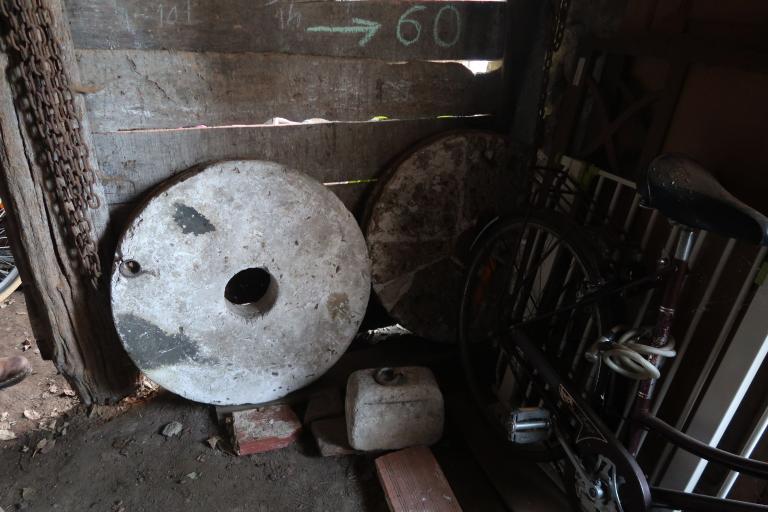 A l’intérieur du bâtiment, un vaisselier est visible au rez-de-chaussée. Une cloison en bois, des marques de tacherons sont présents dans le grenier. L’intérieur des lucarnes dispose de trous pour des poulies. Des planches de bois avec des cordes sont visibles.