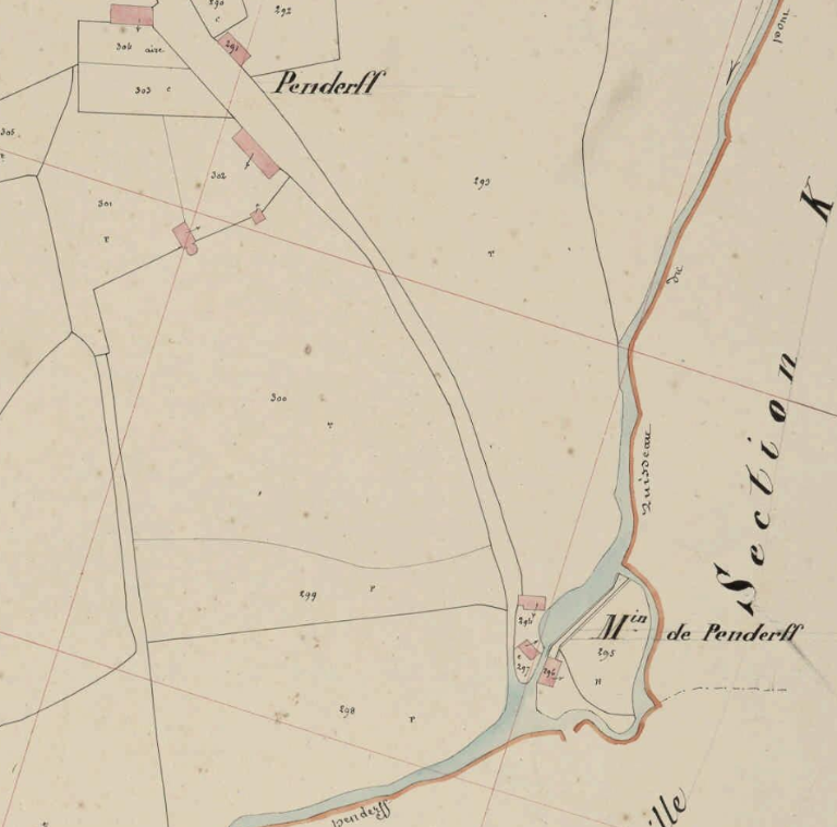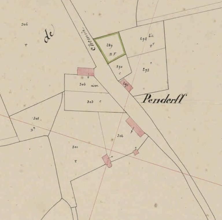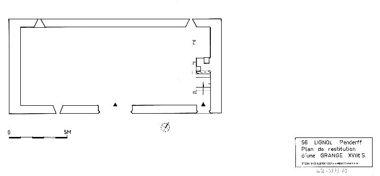 Les dimensions, la qualité et l’époque de construction de la grange et remise de Penderff sont exceptionnelles, liées à l’existence d’un manoir, aujourd’hui disparu : les deux rangées de trous de boulins au sommet du mur accréditent cette origine seigneuriale. La grande porte charretière axiale, en plein cintre, porte la date 1644. La porte piétonne dessert un escalier droit qui mène au comble. Une grange du même type y compris dans sa distribution, datée de 1676, a été étudiée à Kergario dans la même commune, également siège de manoir. Le modèle évoque les grange dîmières.