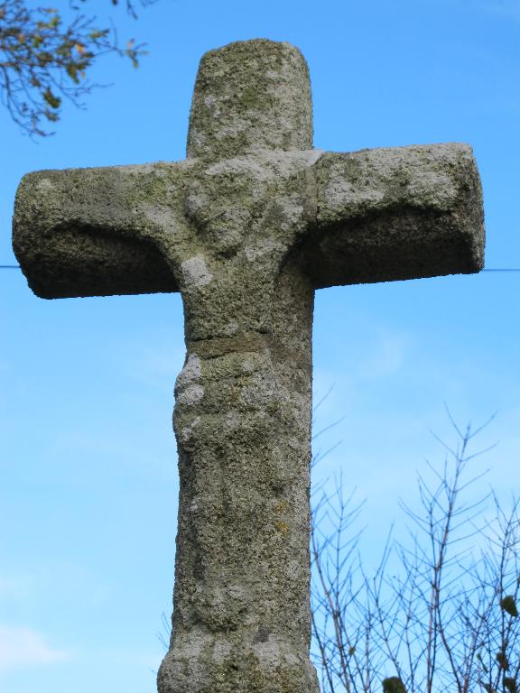 Croix implantée dans un socle monolithe sur soubassement rectangulaire maçonné. Fût brisé. Christ sculpté en bas-relief, silhouette grossièrement sculptée. Pagne indiqué par trois bourrelets. Pieds reposant sur une base annelée. Oeuvre de facture artisanale. (M-M Tugorès, 1967)