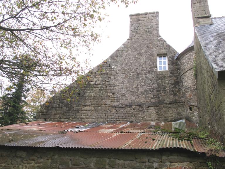 Des deux bâtiments dans le prolongement à l'est existant en 1842, peut-être alors le logis de la ferme d'après les divisions parcellaires en 1842, le premier à l'ouest a disparu, le second a été remanié au début du 21e siècle : l'une des ouvertures remploie un blason des Kerouallan ; tous les bâtiments de service au sud du manoir ont été détruits.