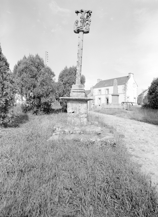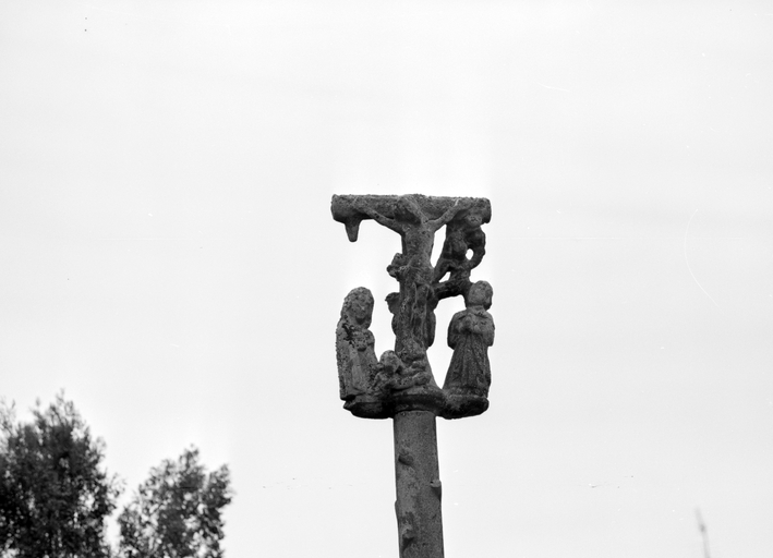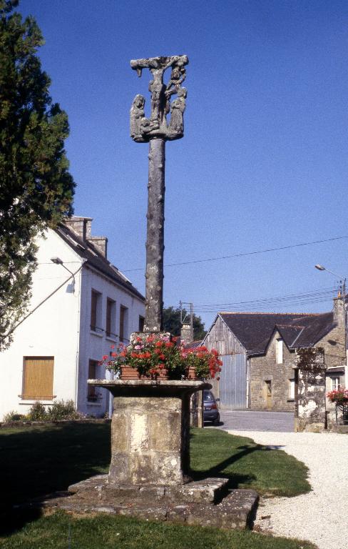 Calvaire formé d'un soubassement appareillé en granite, d'un socle de plan carré, dans lequel est emplanté un fût de schiste à écots. La croix de granite repose sur le fût par l’intermédiaire d'une traverse sur laquelle sont posées deux statues représentant la Vierge et saint Jean. La hampe de la croix a perdu sa partie supérieure ; sur la face est, Christ en croix encadré de deux anges recueillant le sang des mains (celui du sud disparu) ; au pied de la croix, un autre ange recueille le sang des pieds cloués. Au revers côté ouest, Vierge à l'Enfant.