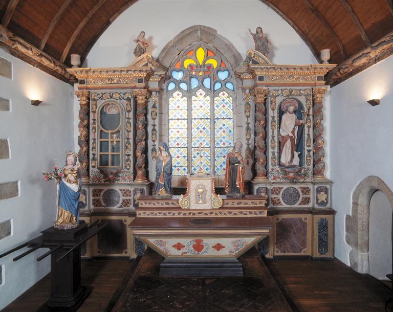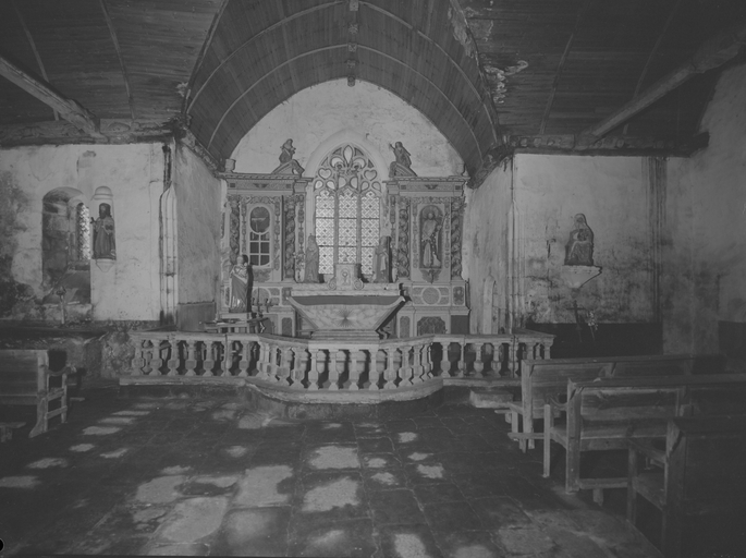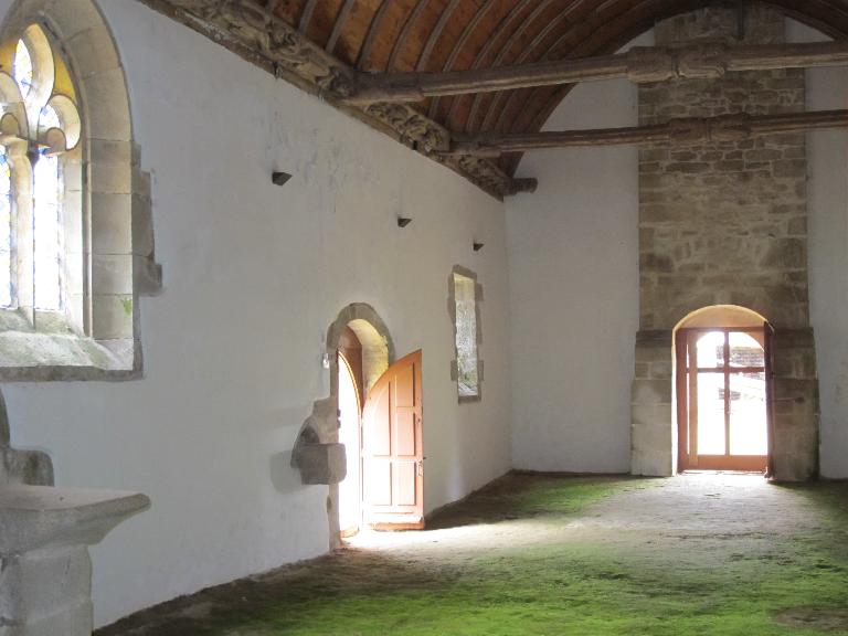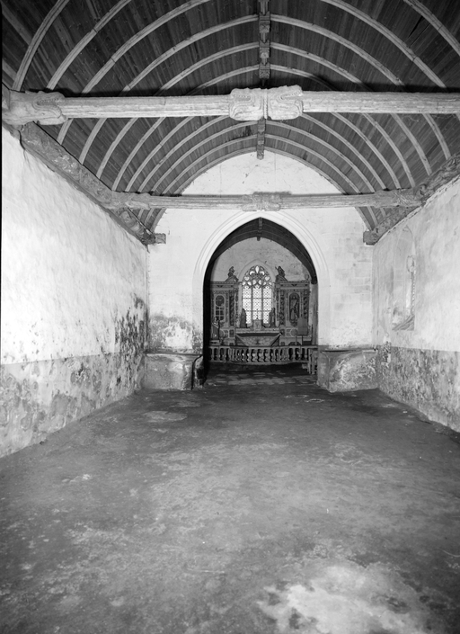 A l’intérieur, la nef est séparée du transept par un arc diaphragme en tiers point, jadis fermé par une clôture ajourée, probablement surmontée par une poutre de gloire dont subsistent les statues de la Vierge et saint Jean. Comme le banc extérieur qui court sur la façade sud, les autels adossés de part et d’autre de l’arc diaphragme sont significatifs d’une chapelle de pèlerinage. Le maintien de l’arc diaphragme révèle l’attachement à une formule ancienne qui sépare les espaces : la nef pour les fidèles, encore en terre battue, les bras de transept jouant le rôle de chapelles seigneuriales avec accès privé par une porte en plein cintre dans le mur ouest du bras sud, le chœur étant réservé au clergé. (C. Toscer)