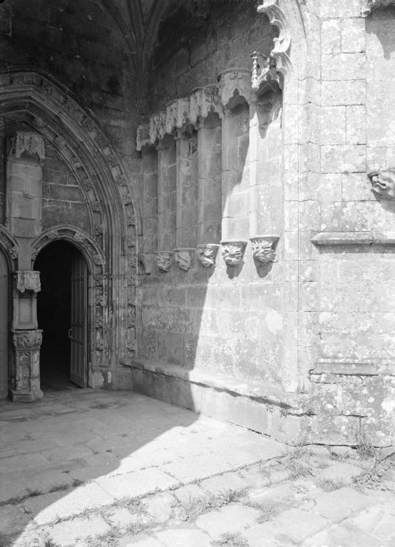 L´élévation sud présente une alternance d´avancées et de retraits de proportions variées qui, comme autant de temps forts et de temps faibles, rythment la composition, et frappe par son unité de style que renforce l´emploi de contreforts ornés de niches à dais et dont le sommet en glacis à quatre pans, forme moderne massivement employée sur le chantier de Kernascléden, sert de socle à des pinacles aigus posés à 45°. Quelques légères différences entre le choeur et le bras sud suggèrent une évolution. Tandis que les consoles des contreforts du choeur sont ornées de feuilles refouillées, celles du bras sud sont sculptées de personnages grotesques jouant avec des chiens, mais surtout la petite porte qui donne accès directement dans le choeur présente encore de grêles colonnettes à peine perceptibles comportant bases prismatiques en flacon et minuscules chapiteaux, modèle sans doute repris des transepts de Quimperlé, alors que celle qui est murée dans le mur ouest du bras sud, dont l´arc externe anguleux vient se fondre dans les piédroits sans chapiteau et les pinacles latéraux atteignent la hauteur du fleuron sommital, témoigne d´une évolution stylistique indéniable semblable à celle constatée sur le porche sud. Enfin, au-dessus de la petite porte du choeur, la superposition d´une niche à dais et d´une rose, percée pour l´élégance du motif, distinguent l'accès réservé au clergé et au seigneur supérieur. Le porche sud par l´association de grandes plages unies et de parties sculptées très localisées résume à lui seul l´économie esthétique de l´édifice. Il est encadré par deux larges et puissants contreforts angulaires qui semblent indiquer l´entrée, équilibrent la masse du pignon uni et lui confèrent une dimension monumentale. Ces contreforts sont ornés sur leurs faces latérales, de part et d´autre de l´entrée, de niches à dais semblables à celles qui ornent les autres contreforts de la chapelle et couronnés d´un faisceau de pinacles de section cylindrique dont le modèle est directement emprunté au chevet de Kernascléden. Sur ce frontispice presque dépouillé, le lambrequin à arcs trilobés et accolade ornée de feuilles retournées qui souligne l´ouverture du porche prend toute sa valeur. À l´image de l´ensemble du décor de la chapelle, l´intérieur du porche illustre ce goût pour une certaine épuration stylistique qui vise à l´efficacité. Les deux séries de niches prévues pour recevoir les statues des apôtres reprennent en continu le principe de celles des contreforts qui se résume à un simple enfoncement dans le mur dépourvu de toutes colonnettes ou moulures. Cette conception épurée, adaptée aux proportions du porche, vise également à valoriser le portail lui-même, principal accès à l´intérieur de la chapelle. Ce dernier - une grande arcade en tiers-point incluant deux portes géminées de forme et de décor semblables, sous un tympan plein devant lequel devait s´inscrire une statue de trumeau - est une transposition trait pour trait, et de dimensions identiques, de celui du chœur de Kernascléden. La même savante économie se retrouve dans la sculpture du porche dont Léon de Groër fait remarquer le style particulier. Les socles des niches, au lieu d´être sculptés de figures ou de feuillages retournés et refouillés comme sur le chœur, sont ici ornés d´une unique et large feuille souple qui semble comme plaquée par le vent : ce trait, accentué sur les contreforts de l´entrée, révèle une évolution qui se démarque nettement de l´ornementation recherchée et précieuse, presque méticuleuse, rencontrée à Kernascléden. Là encore et comme pour la composition de la façade, loin d'être due seulement à une différence dans le budget du chantier, il s´agit bien d´une recherche de style.