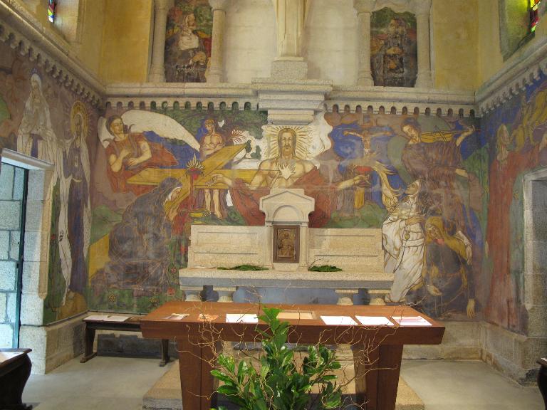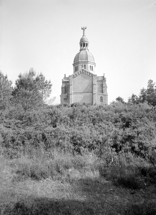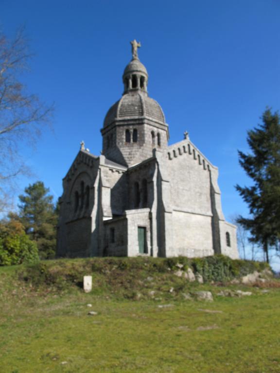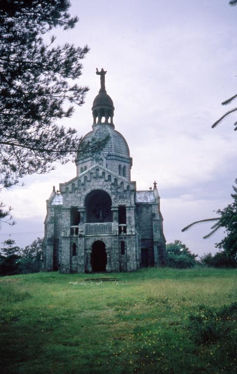 Non orientée, puisque le chœur se trouve au sud, la chapelle est construite sur un vaste promontoire rocheux aplani dominant les alentours et le bourg proche. De style néo-roman, elle est édifiée en moellon régulier de granite sur soubassement en pierre de taille. A la croisée de son plan en croix grecque, la tour octogonale est surmontée d'une coupole octogonale sur trompe couverte en pierre, couronnée par un lanternon. Les bras de transept, le chœur et la nef sont couverts d'ardoise. La nef se prolonge au nord par un narthex à étage, inspiré de l'architecture carolingienne, qui forme une tribune ouverte sur l'extérieur au 2d niveau. Des peintures ornent l'ensemble des murs et de la voûte.