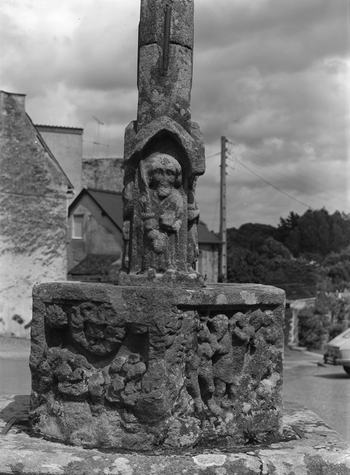 Croix à dais en accolade sur soubassement et emmarchement en pierre de taille de granite ; fût de section octogonale et carrée dans sa partie inférieure, enfoncé dans un socle polygonal. Décor en ronde bosse sur la croix : Calvaire ; Descente de croix. Décor en haut relief sur la base du fût : saint Jean-Baptiste ; saint Jacques le Majeur ; saint Pierre ; saint Paul. Décor en haut relief sur les faces du socle : Baiser de Judas ; Flagellation du Christ ; Montée au Calvaire ; Jésus cloué sur la croix ; Descente aux limbes ; Ascension.