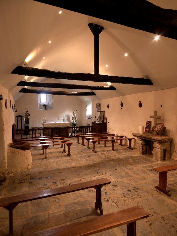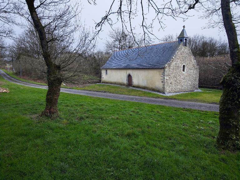 Chapelle de plan rectangulaire, construite en moellon de granite et partiellement enduite. La nef, à vaisseau unique et dotée de vases acoustiques insérés dans la maçonnerie, n'est éclairée que par trois baies toutes différentes (en arc segmentaire au sud, en berceau et avec fenestrage à l'est). Celle au nord porte un blason mi-parti, résultat de l'union des armes de la famille d'Isabeau de Talhouët : d’argent à trois pommes de pin versées de gueules, soit ici une pomme de pin, avec les armes de Robert (de Kerangat ?), dont les armes n'ont pas été identifiées. L'autre blason est la représentation inversée de l'autre. La porte au nord est en arc brisé chanfreiné. Le clocheton est couvert d'ardoises. Nef avec lambris de couvrement.