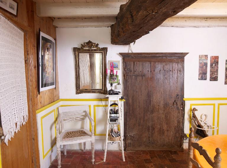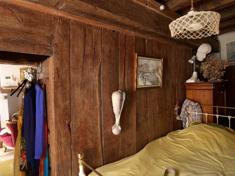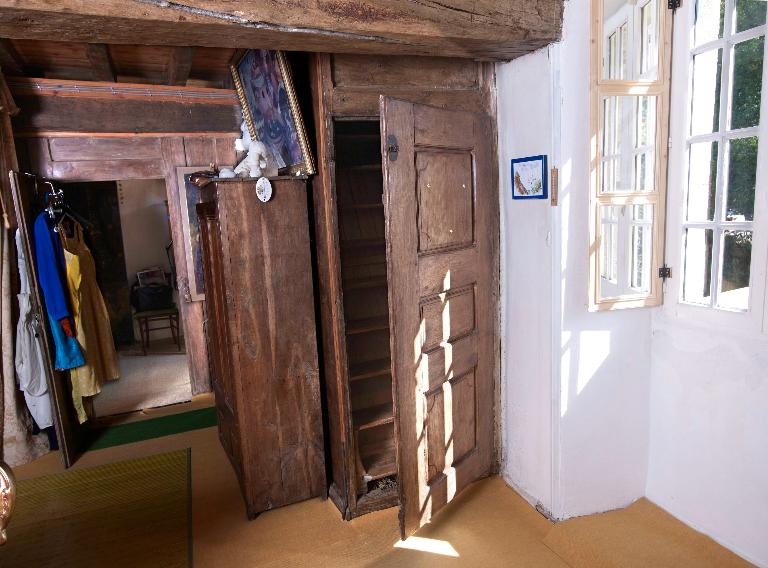 L’étage est divisé en deux parties par une cloison en chêne à panneaux moulurés qui délimite également dans la chambre à l’ouest la cage d’escalier menant au comble. Cette chambre est chauffée par une cheminée dont seuls les piédroits en forme de pilastres sont conservés. Une fenêtre l’éclaire au sud. L’arrivée de l’escalier donne sur un espace à usage indéterminé qui conduit vers l’appentis postérieur par une porte en vis-à-vis. Cette porte donne accès aux latrines contenues dans un corps en demi hors-oeuvre, et au grenier de l’appentis.