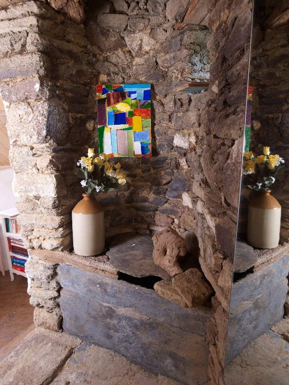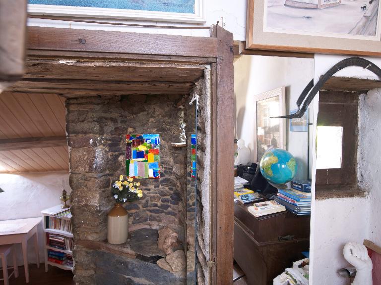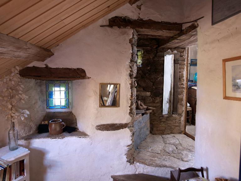 Au rez-de-chaussée, la pièce comprend une cheminée à linteau et console de bois en quart de rond sur le pignon est. La pièce est éclairée par une fenêtre au sud avec appui en schiste sous lequel est logée une armoire murale à étagère en dalle de schiste. Une porte permet la communication avec le logis à l’ouest. Une 3e porte dans le mur nord débouche dans l’appentis par l’intermédiaire de quelques marches : à usage de cellier, cet appentis est éclairé par deux jours situés dans les demi-pignons est et ouest.