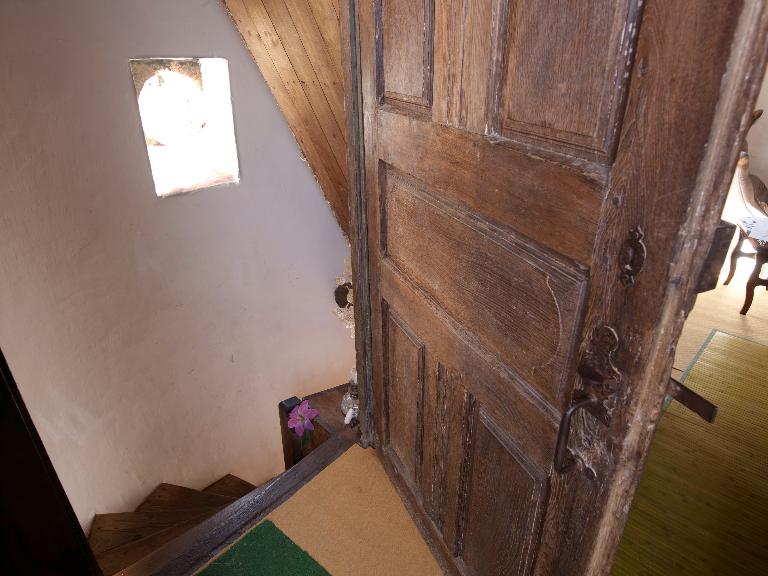 Éclairé par un oculus en demi-étage, l’escalier se situe entre la porte et la fenêtre : en bois à retour, il est logé dans un renfoncement arrondi du mur qui révèle l’existence antérieure d’un escalier en vis.