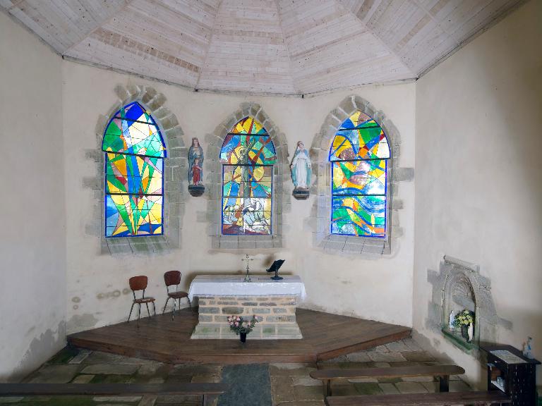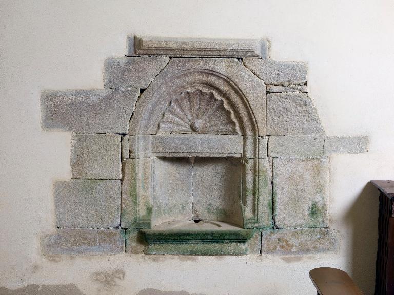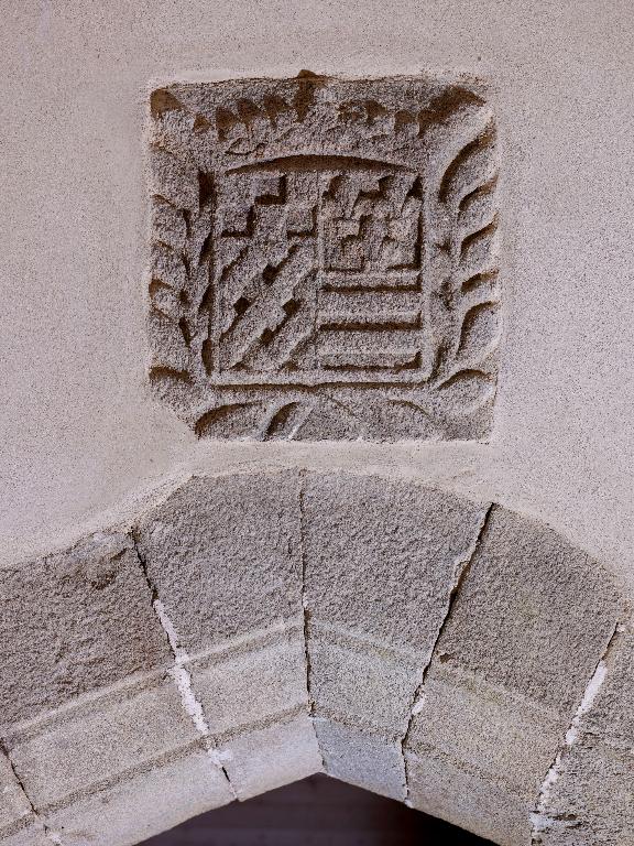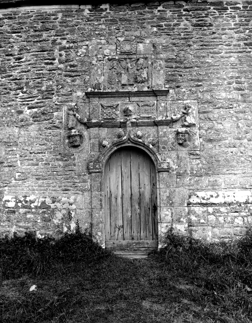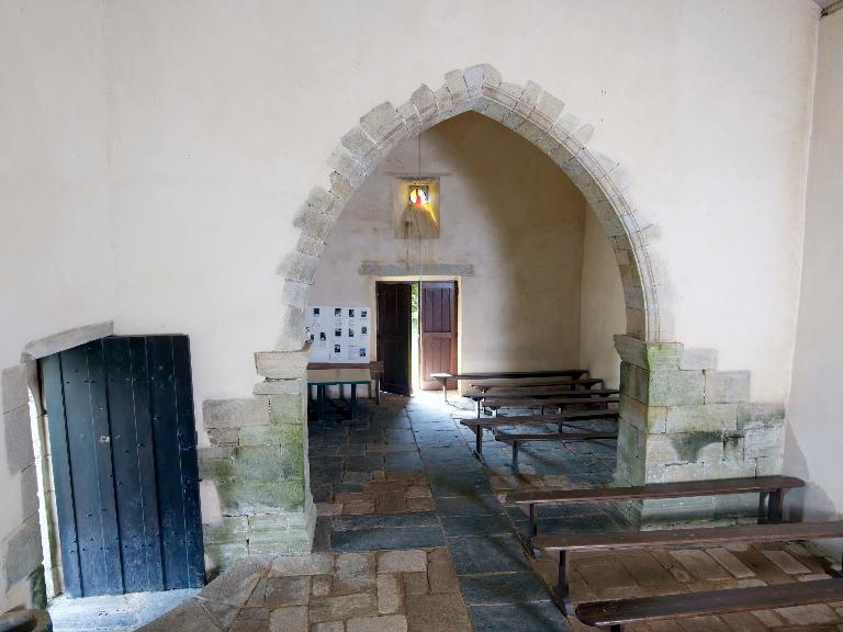 Archaïque, l’arc diaphragme a ici un rôle purement formel, celui d’isoler l’espace du chœur et de la chapelle seigneuriale, de la minuscule nef des fidèles : l’apposition du blason au-dessus de l’arc affirme la prestigieuse alliance de René du Matz avec l’héritière d’une puissante famille bretonne, Gillonne de la Marzelière, vers 1630-1640. Cette affirmation est réitérée par l’insertion des blasons dans le décor de la porte sud, en partie recomposée. (C. Toscer)