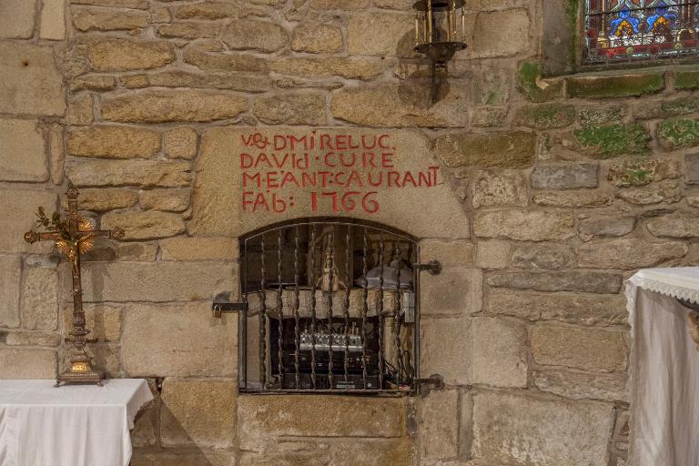 Choeur, chapelle nord, 3 dernières travées de nef 16e siècle. Charpente remaniée en 1729. Chevet remanié en 1766, inscription : " V ET D MIRE LUC DAVID CURE M E ANT CAURANT FAB 1766 ". 3 premières travées de nef et massif occidental reconstruit en 1772 (date sur le clocher).