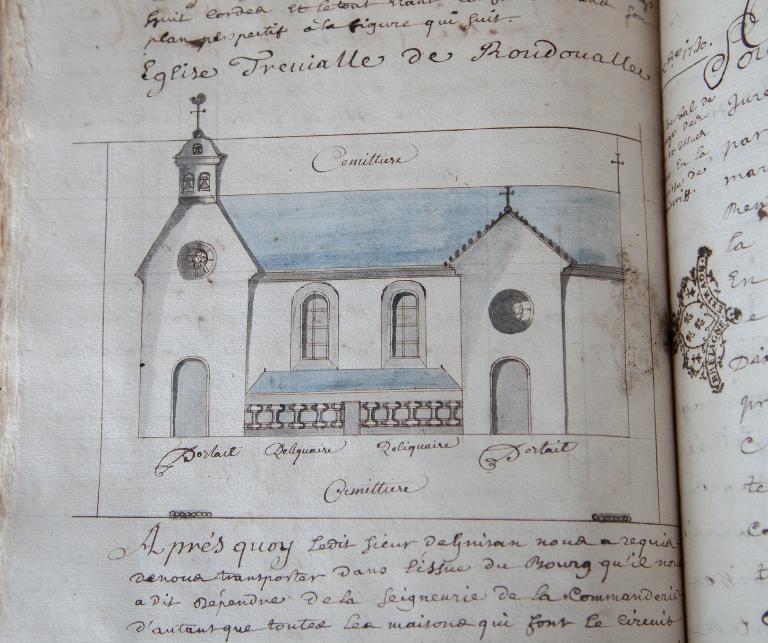 En 1160, les Hospitaliers se voient confirmer une aumône an Rodoudoed Gallec, par le duc Conan IV. En 1540, frère Jean de La Barre commandeur de Quimper et Beauvoir rend aveu pour sa commanderie et mentionne des droits en la chappelle et membre de Ruidezgallec. Le siècle suivant, lemmandeur Leonor Beaulieu de Belthomas déclare qu’en la paroisse de Gourin, La Treve de Saint Jean de Roudouallec avec ses issües, apartenances et dépendances apartient audit Commandeur avec tous les honnneurs, droits ainsi que dans touttes les autres Eglizes dépandantes de ladite Commanderie. Et il précise la même année, dans son Estat du Revenu et des améliorations de sa commanderie, qu’est fondée en lhonneur de Notre dame et de St. Jean baptiste et n’est tenu le Sieur commandeur à aucun service aux esglize dans leq. Lieu de Roudouallec. Dans le terrier de la commanderie de La Feuillée dressé en 1705, le croquis d’arpentage présente une église de plan basilical à vaisseau central et un bas-côté, un transept et un chœur. Un reliquaire prolonge, à l’extérieur, le mur-gouttereau sud de la nef, et le cimetière occupe entièrement le placître. Puis, dans le terrier établi en 1731, on trouve une aquarelle figurant la façade méridionale de l’église, malgré l’aspect schématique de l’illustration, on distingue aisément la façade occidentale, le reliquaire, le bras de transept sud en saillie et le chœur. La seconde moitié du XVIIIe siècle voit se succéder de nombreux travaux qui vont profondément remanier l’église. En 1766, le chevet est restauré comme l’indique l’inscription sur le mur nord du chœur : V. & D MIRELUC DAVID CURE [Messire Luc David] / M. E. ANT : CAURANT / FA B : 1766, six ans plus tard, les trois premières travées et le clocher sont reconstruits, sur l’impulsion d'un clerc homonyme, David, qui a succédé au précèdent, et dont on voit l’inscription sur la face sud du clocher : COURTOIS : CURÉ : Y : DAVID [Yves David] : PRETRE.