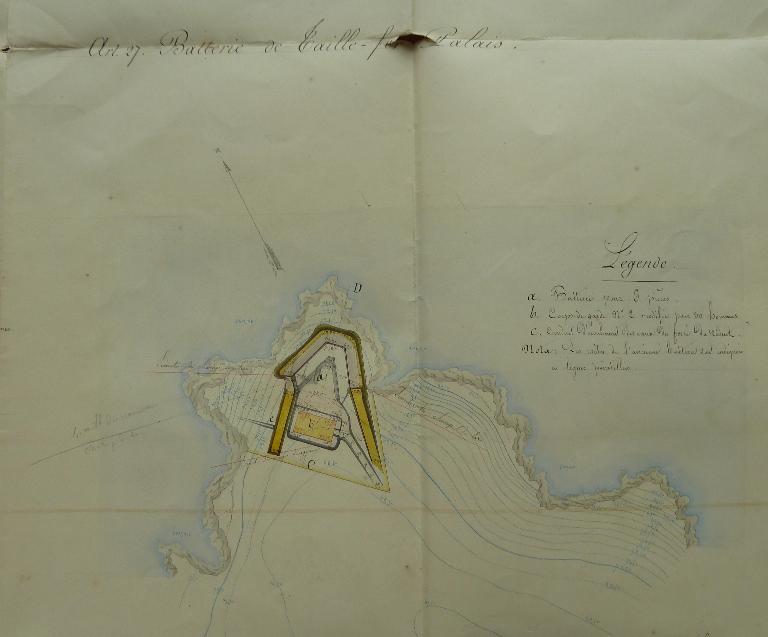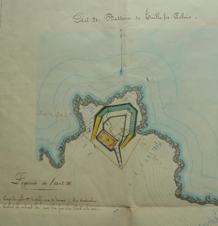 Système de défense de Belle-Ile. La citadelle du Palais, renferme les établissements nécessaires à la garnison de l'Ile entière. Commencé par le cardinal de Retz, continué par Fouquet, cet ouvrage présente un tracé irrégulier, et se trouve sous le commandement des hauteurs voisines. Vauban voulut changer sa situation ; il en fut empêché par un ordre exprès de Louis XIV ; et obligé de conserver les restes du fort Gondi, il se contenta d'indiquer les améliorations entreprises depuis, et que l'on complète en ce moment.