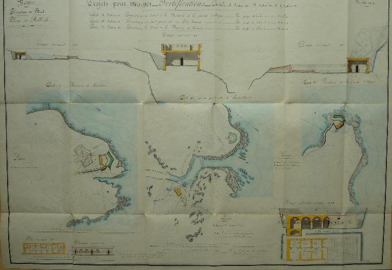Service historique de la Défense, département Armée de Terre, Vincennes. Archives du Génie ; Article 8, Places françaises et d'Algérie : 1 VH 296, Place de Belle-Île-en-Mer, projets et dépenses annuels, 1860-1861. Direction du Génie de Brest, Place de Belle-Ile, Mémoire du chef du Génie sur les projets pour 1860-1861, 20 novembre 1859.