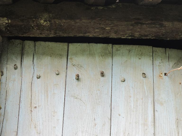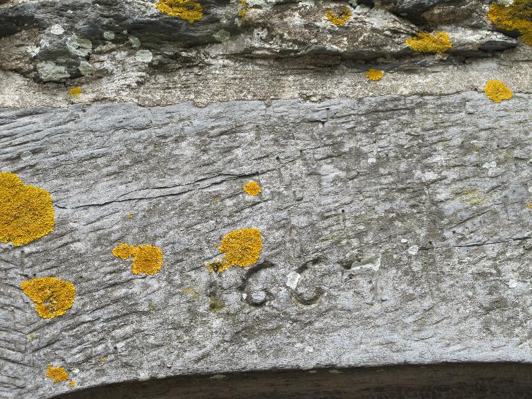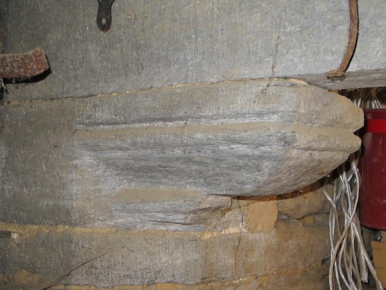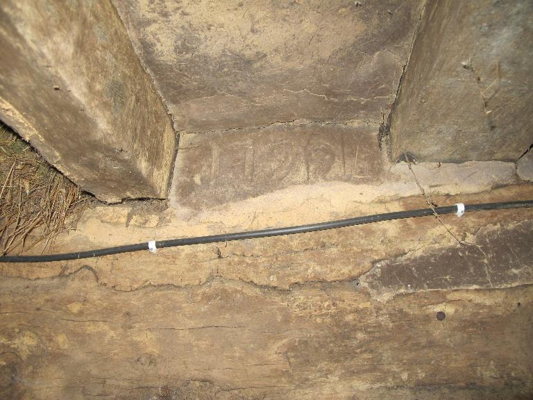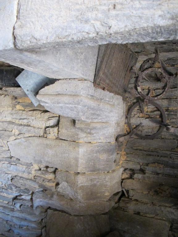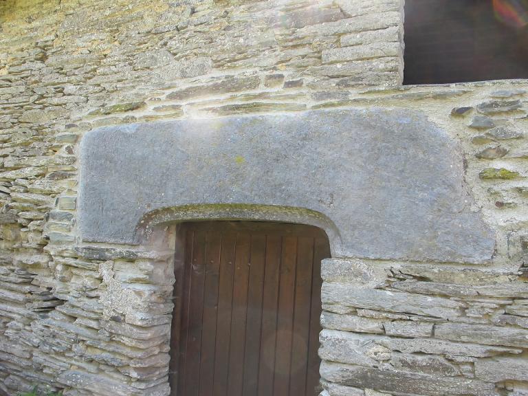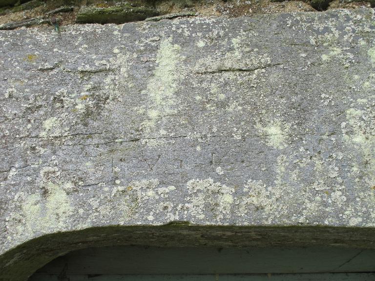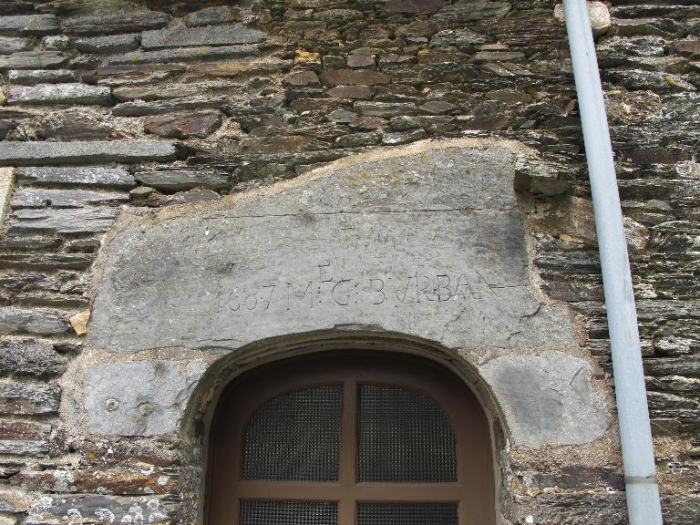 Grand linteau de schiste en anse de panier portant une inscription gravée : 1687 Me : G : BURBAN ; il peut s’agir de Gilles Burban (1612-1710), décédé à la Corbais ou de Guillaume Burban (1624-1708) (d’après Généatique MX).