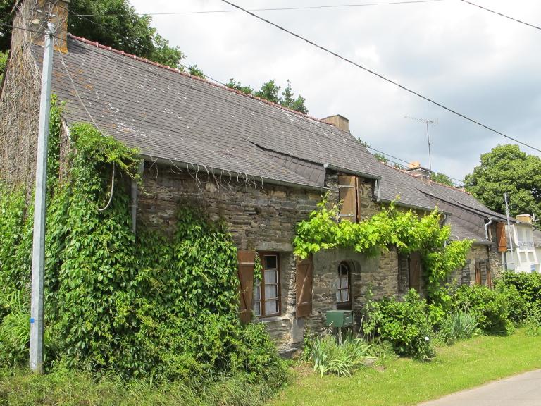 Logis jumelés (?) ou plutôt grande maison de plan rectangulaire à pièces symétriquement disposées de part et d'autre d’une porte centrale à encadrements en granite ; rez-de-chaussée surmonté d’un étage dont les cinq fenêtres forment travée avec les baies inférieures ; au-dessus, un comble à surcroît à deux lucarnes passantes participant aux travées ; murs enduits, encadrements des baies et chaînes d’angle alternées en pierre de taille de schiste ; sur une pierre d’angle, inscription gravée incomplète : CONSTRUY LAN 1906 PAR IOSSET / FRANCOIS MAEGRET E-- / F-- ; escalier moderne extérieur à une extrémité.