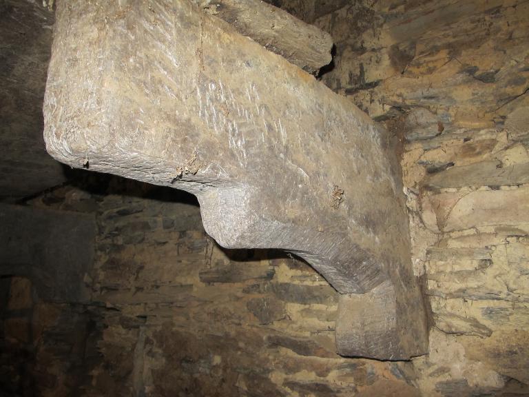 Logis de plan allongé à deux pièces symétriques ; rez-de-chaussée surmonté d’un surcroît à lucarne rampante (19e siècle) formant travée avec la porte du logis dont le linteau est en schiste ; fort coyau ; cheminée ouest en schiste, dont les consoles sont indépendantes des sommiers ; cheminée en bois (19e siècle) ; escalier en vis dans une tour demi-hors œuvre postérieure.