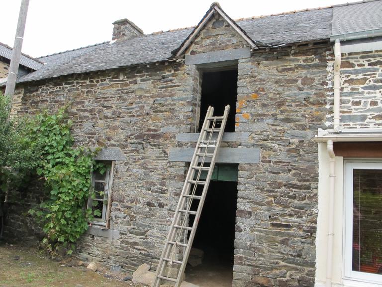 Logis-étable à deux portes (?, celle de droite transformée en fenêtre au 19e siècle) ; rez-de-chaussée surmonté d’un comble à surcroît à gerbière incluse sous le toit ; piédroits des baies en moellons de schiste chaulés, linteau commun en bois de la porte et de la fenêtre gauche.
