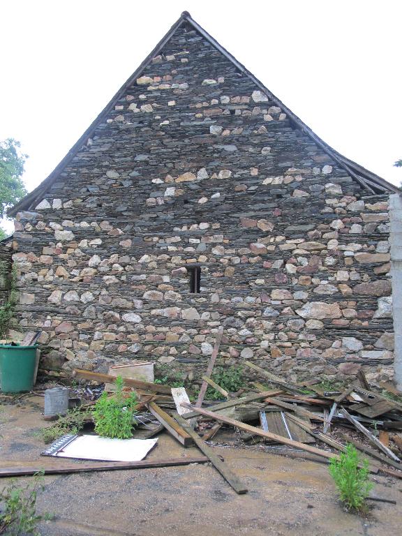 Vaste édifice double en profondeur constitué de deux logis jumelés ; rez-de-chaussée surmonté d’un comble à très haut surcroît éclairé en façade principale par deux portes hautes passantes qui forment travées avec les portes centrales inférieures ; deux fenêtres dans le pignon ; appentis contre une partie de la façade postérieure ; linteaux en pierre de taille de schiste ; moellons de schiste posés à sec ; très bonne restauration.