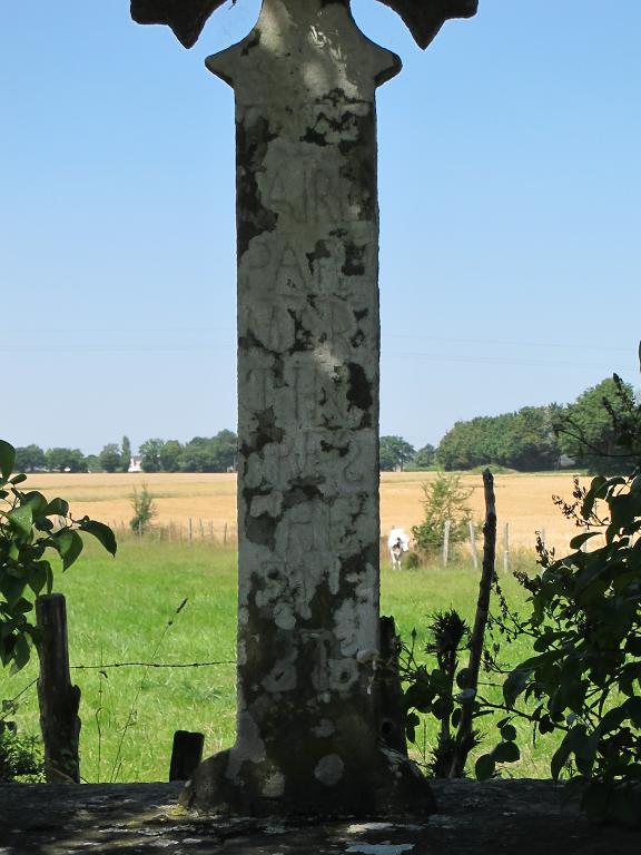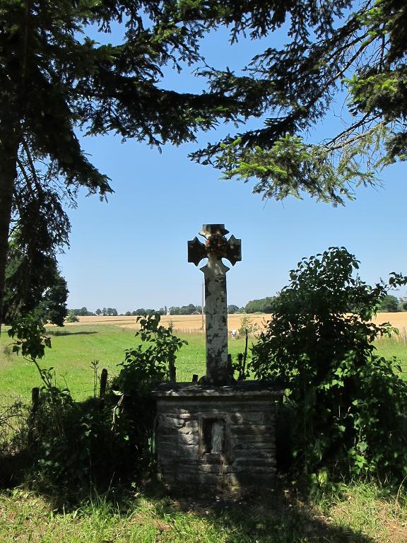 Croix monolithe sur soubassement en moellons couvert d'une dalle moulurée en congé ; niche en face sud du soubassement.