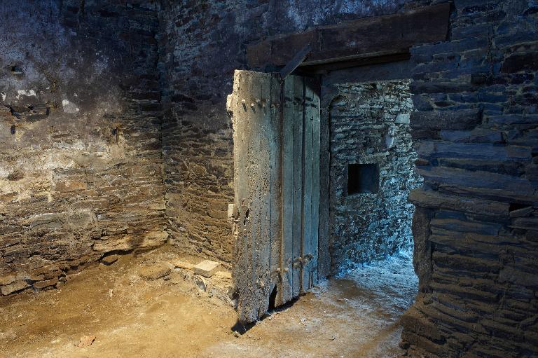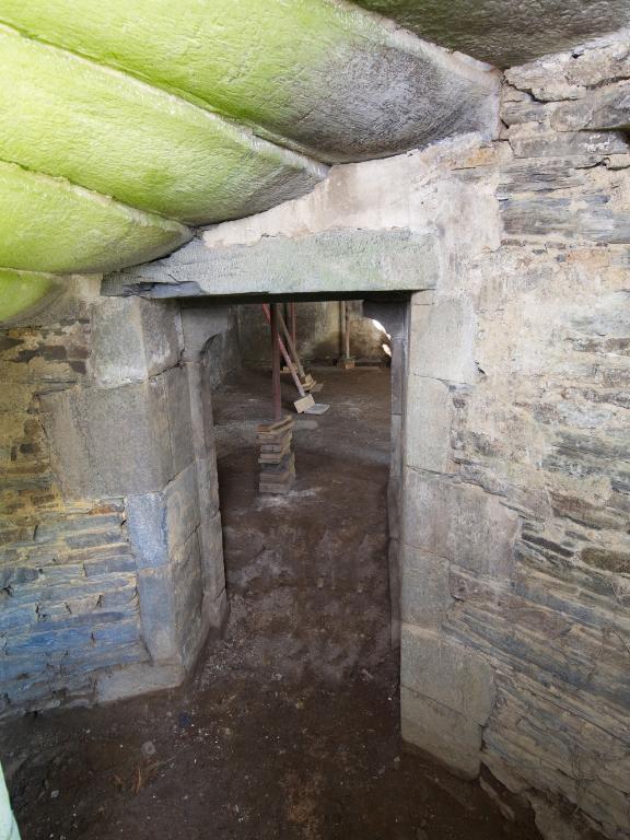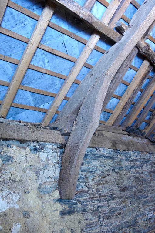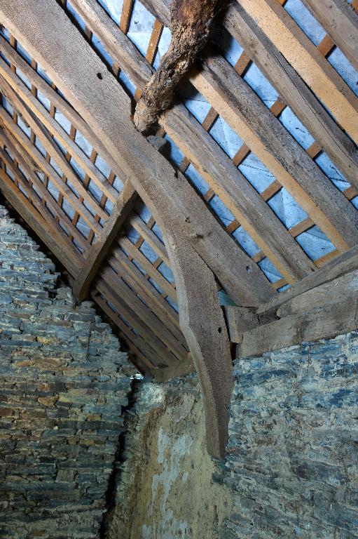 À l'ouest, la chambre au-dessus du cellier est la mieux conservée ; sa charpente apparente en berceau, une charpente armoricaine, est blasonnée d’un écu lisse autrefois peint des armes de la famille. Il ne reste que des vestiges de sa cheminée, dont les minces lames de schiste formant consoles saillent fortement sur le mur extérieur - un caractère commun aux cheminées de schiste du secteur. Ce petit espace confortable et soigné est aujourd’hui inaccessible, si ce n'est par sa fenêtre à coussiège : la porte, donnant dans la chambre sud a été bouchée à une époque inconnue.