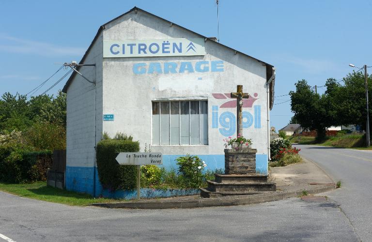 Croix latine en granite sur soubassement. Soubassement moderne couvert d'une dalle ancienne très épaisse au profil mouluré. Fût de section circulaire en deux morceaux. Décor en demi-relief sur la face principale de la croix : Christ en croix ; cinq trous, dans la partie inférieure du fût, représentent les cinq plaies du Christ.