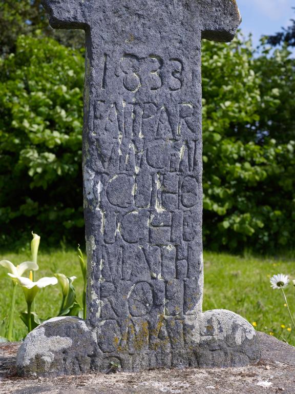 Croix construite en 1833, portant l'inscription : 1833 / FAIT PAR / VINCEN / T GUIHO / UCHE / MATH / ROLL /O MATHU / RIN QUELARD.