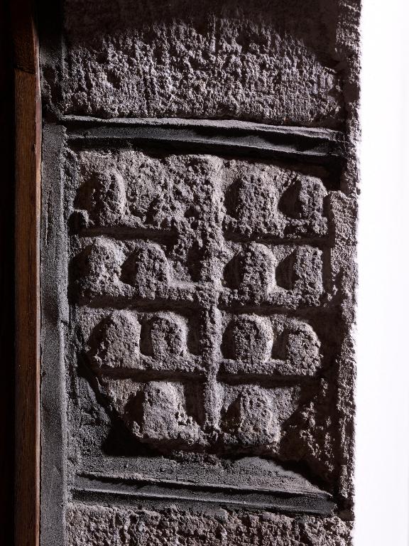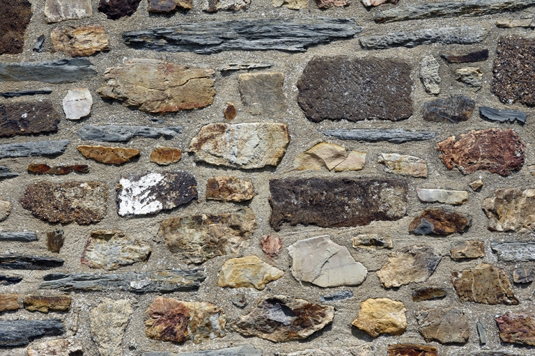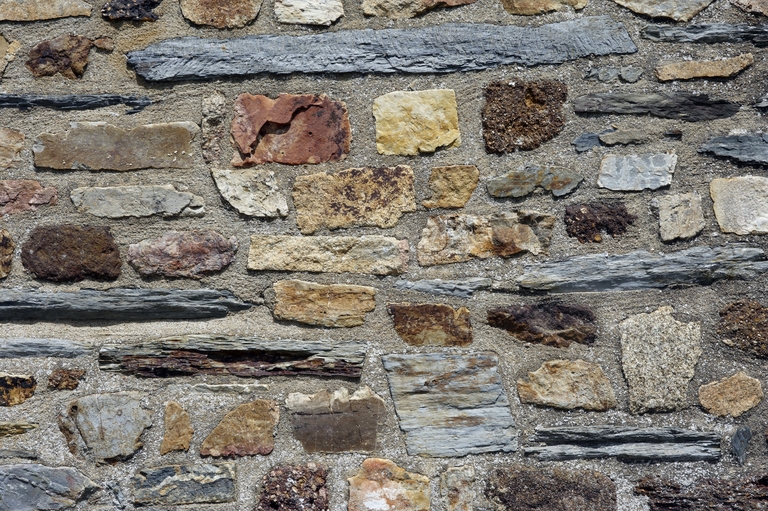 - Les murs extérieurs en moellons de schiste sont couronnés d’une corniche en béton.