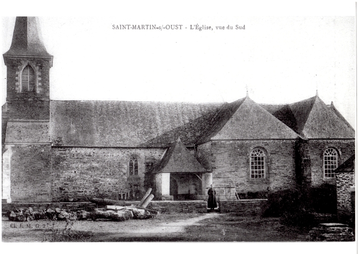 SAINT-MARTIN-s/-Oust – L’église, vue du Sud. Carte postale, Saint-Martin-sur-Oust, J. M. Gougeon, phot., vers 1914.