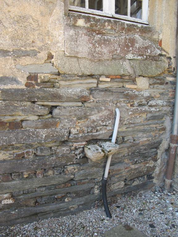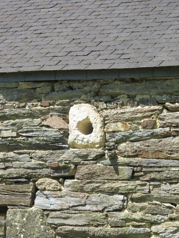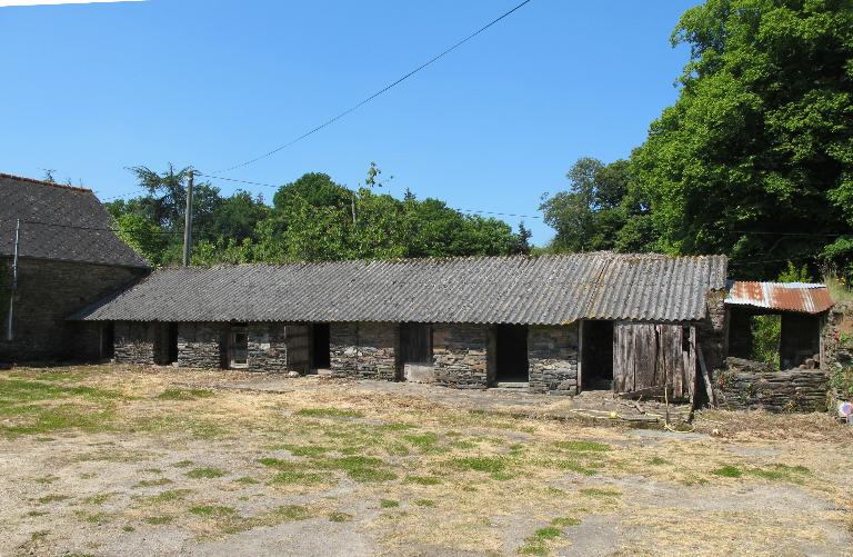 Le logis de l’est, aux ouvertures en granite et bois (linteau de la porte), se poursuit par une petite étable surmontée d’un comble qu’éclaire une lucarne passante (récente) en parpaings, à fronton triangulaire en bois et linteau en arc surbaissé ; plus loin, une soue couverte en appentis. Le logis de l’ouest comporte aujourd’hui deux portes (celle de droite est récente) et une fenêtre à linteaux de bois. Dans le montant droit de la porte gauche, des blocs de calcaire renvoient à la fenêtre incluse sous le toit, qui fait travée avec la porte : ses encadrements sont entièrement en pierre de taille de calcaire, mis à part l’appui qui est en schiste.