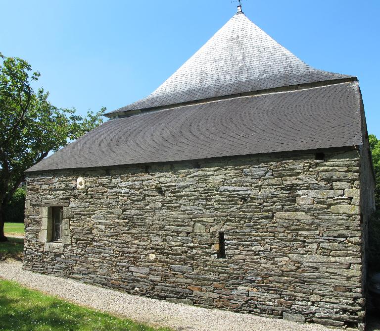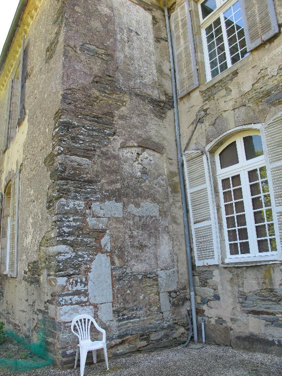 Bâtiment construit en moellons de schiste – enduits sur les façades sud et ouest ; encadrements des portes et fenêtres du rez-de-chaussée en pierre de taille de granite à chaînes alternées ; corniche sud et ouest à denticules et lucarnes sud en calcaire à clé pendante. La façade est ne comporte ni lucarne ni corniche ; la façade nord est aveugle, sauf une fenêtre de comble incluse sous le toit, à encadrement de bois ; sa corniche en quart de rond est en schiste. Important coyau.