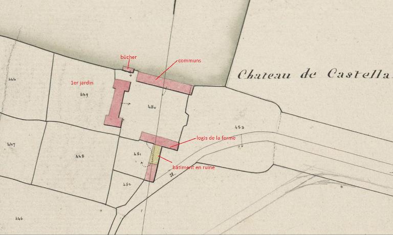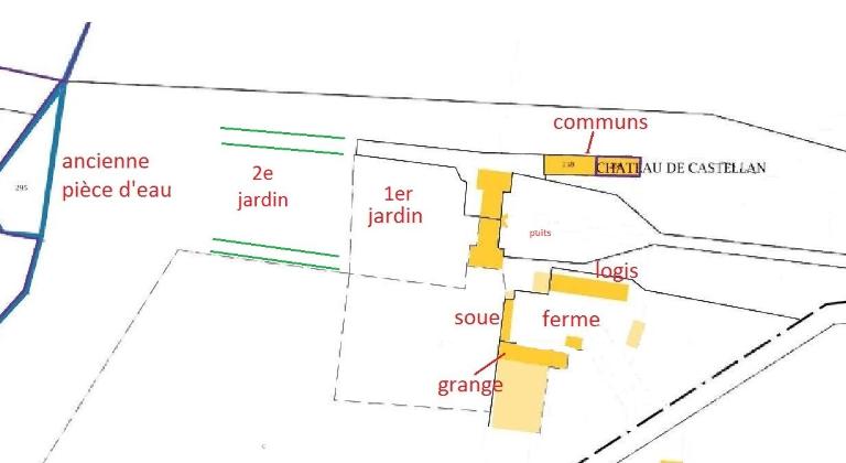 Face à lui, mais au sud-est, la ferme s'est également transformée : le logis occupe la même place qu'en 1825 mais on a supprimé une aile perpendiculaire et ajouté à l'ouest un bâtiment en équerre abritant une remise, des soues et un bûcher qui remplace celui à l'ouest des communs. Le jardin d'agrément a été réalisé à l'instigation de M. de Castellan au début du 18e siècle.