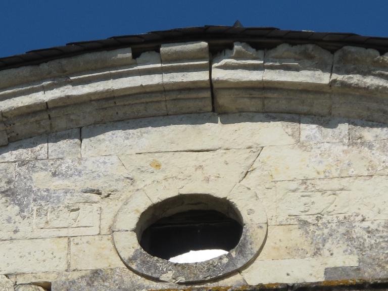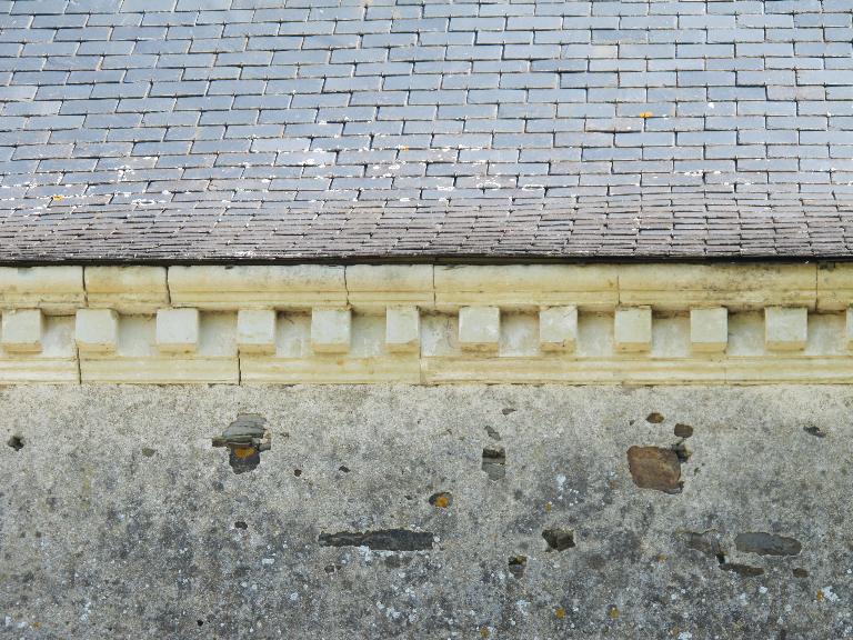 Le matériau utilisé pour la partie supérieure est le calcaire ; on le retrouve dans les lucarnes en plein cintre et la corniche : simplement moulurée depuis l’angle nord-est à l’angle sud-ouest, elle est ornée de denticules de l’angle sud-ouest à l’angle nord-est.