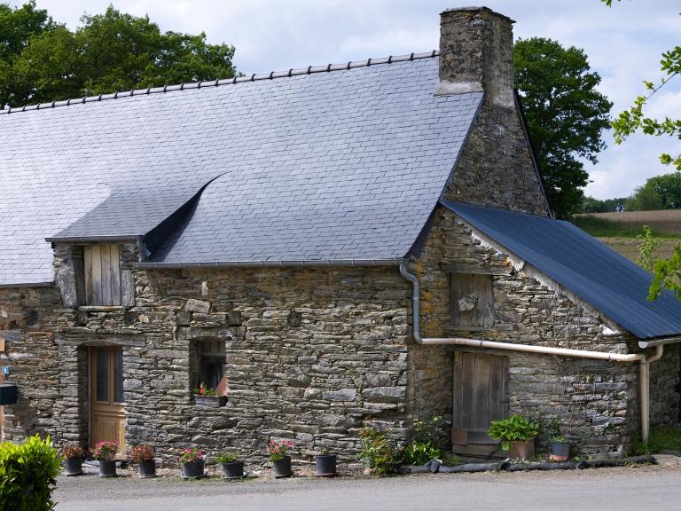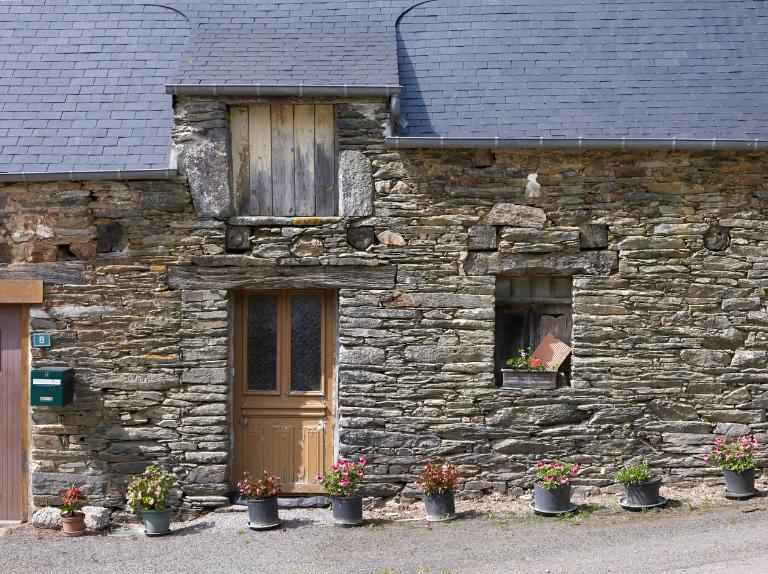 Ferme constituée d’un logis de plan massé à pièce unique, encadré de deux dépendances agricoles. L’ensemble est construit en moellons de schiste qui constituent également les piédroits des baies à linteau de bois. Au-dessus de la porte et de la fenêtre, on distingue les abouts de poutres qui supportent le plancher du comble.