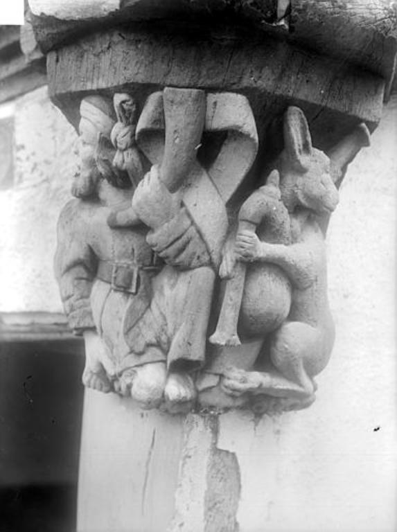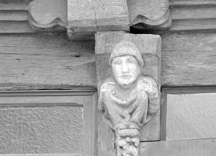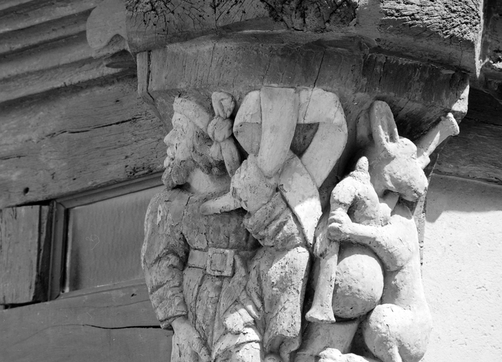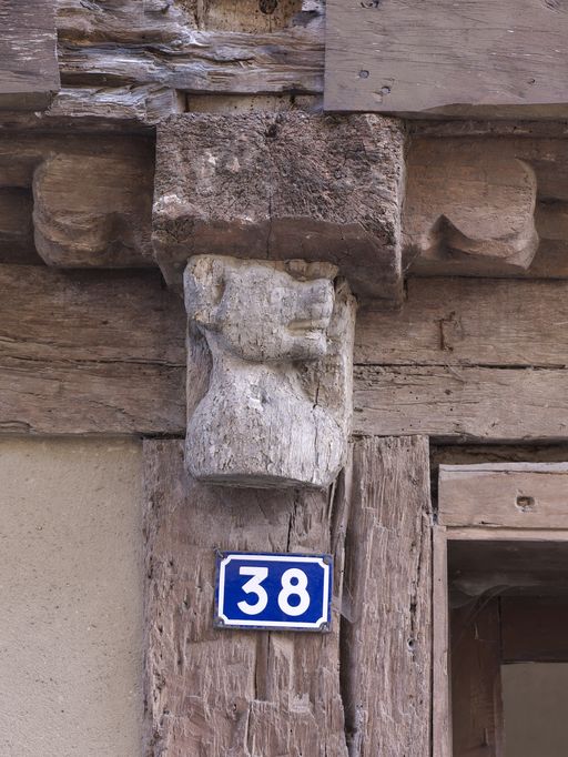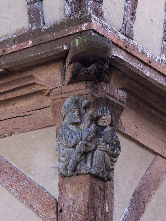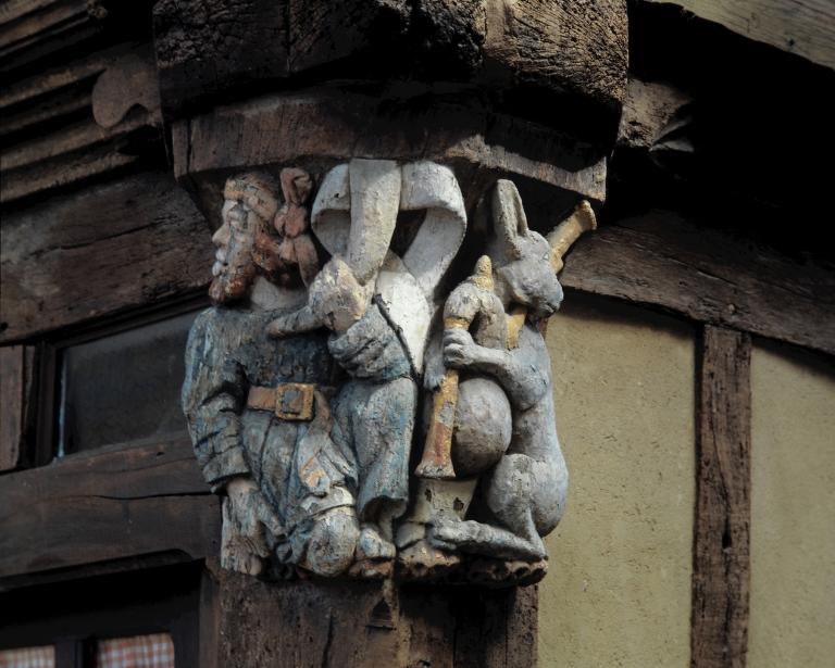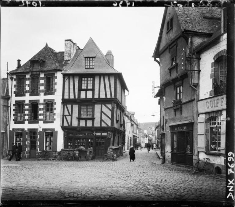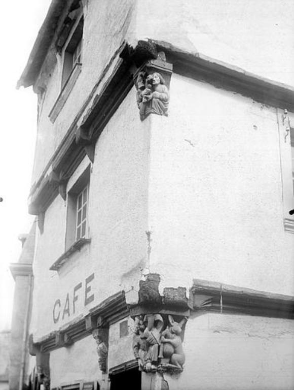 Sur la place du Bouffay, la "maison de la Truie qui file" a conservé ses anciens étals en dalles de schiste vert et sa cave, directement ouverte sur la place. Au rez-de-chaussée, les aisseliers sont ornés de sculptures représentant des grotesques : un homme endormi et agenouillé porte un gourdin, plus loin un homme accroupi ; à l'angle un homme accroupi joue du cor, tandis que sur l'autre face, c'est un lapin qui joue de la cornemuse ; une tête de dragon, une tête de chien, enfin la truie qui file qui a donné son nom à la maison. Au premier étage, le poteau cornier est "orné" d'un homme qui bat sa femme.