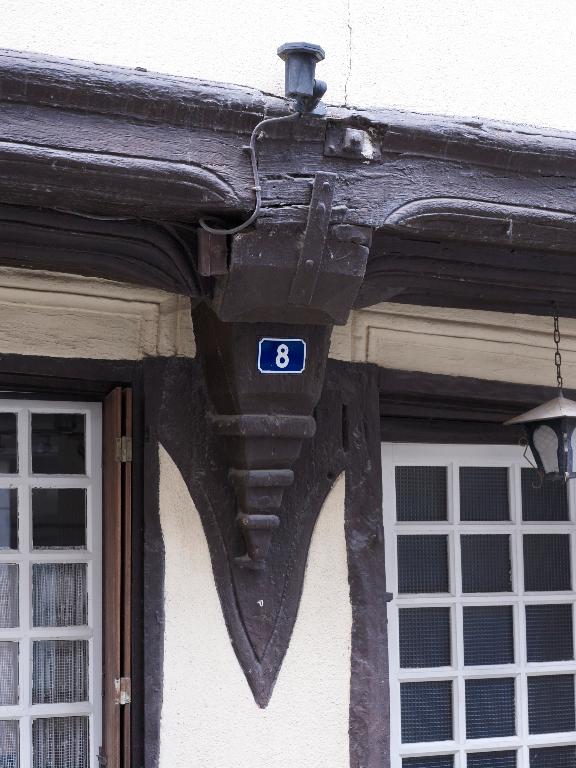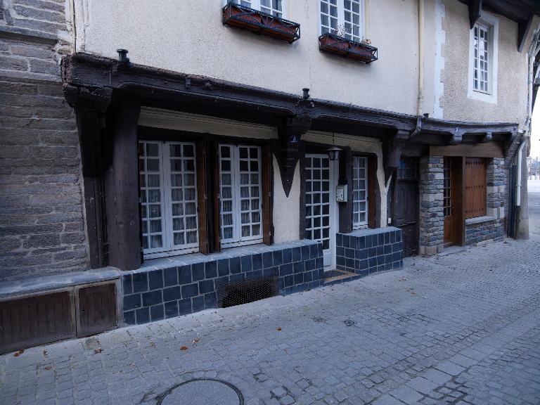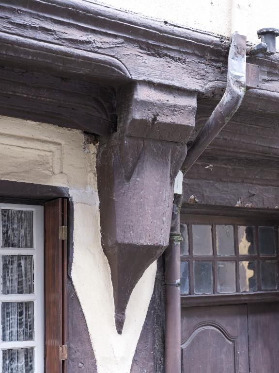 En élévation antérieure, le pan de bois est recouvert d'un enduit. Le premier niveau est constitué de poteaux et d'un pilier en maçonnerie portant les poutres dont les abouts sont moulurés et portent la sablière de chambrée ; sous celle-ci, entretoise et sablière de plancher ; ces pièces de bois sont moulurées en sifflet ; même disposition au deuxième niveau de sablières. On notera que les poteaux du deuxième niveau ne sont pas placés au droit des poteaux du premier niveau ; la structure intermédiaire du pan de bois n'est pas apparente.