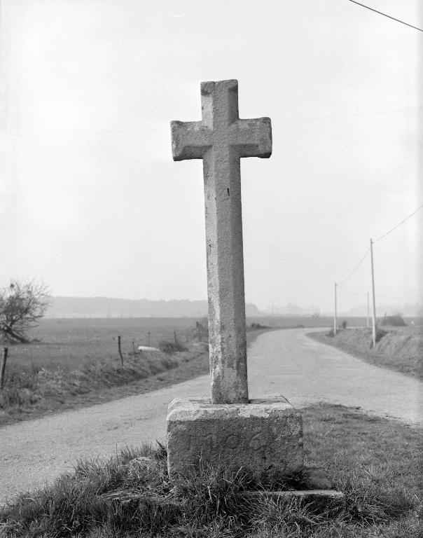Croix monolithe, sur socle ; fût de section carrée ; croix et fût chanfreinés sauf l'extrémité des branches de la croix. Décor : IHS.