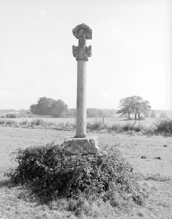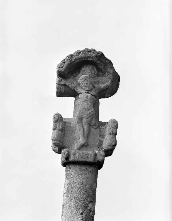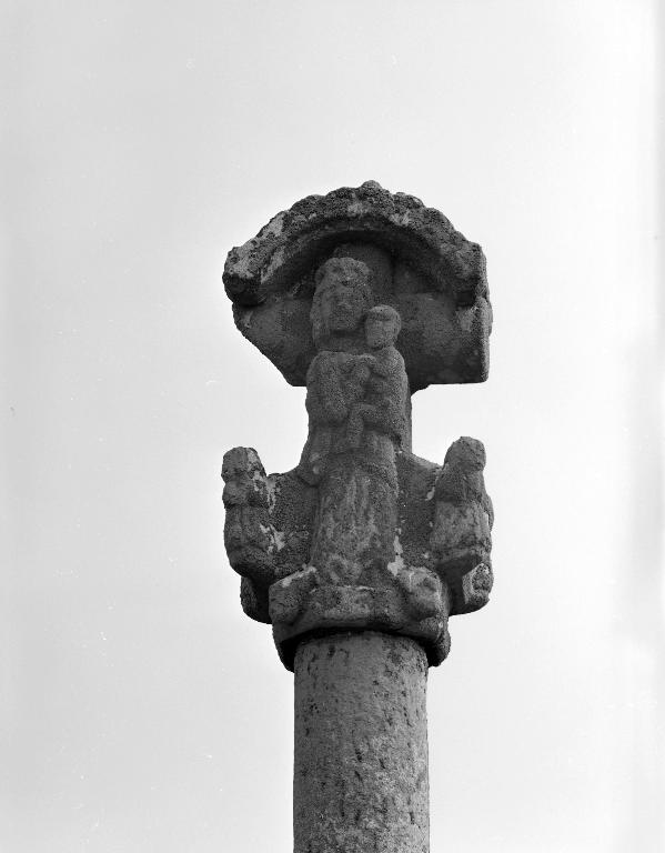 Croix à dais, sur socle ; fût de section circulaire. Décor en haut-relief sur une face : Christ en croix, ses pieds posés l'un sur l'autre avec flexion externe du pied droit ; sur l'autre face : Vierge à l'Enfant ; sur les faces latérales : anges.