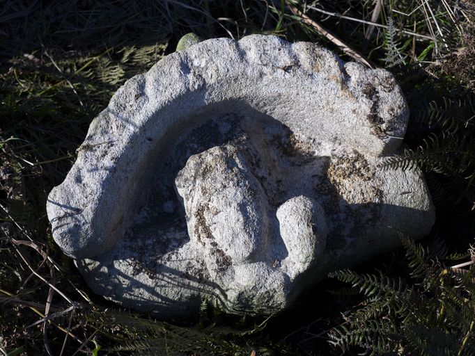 Le haut de la croix : dais et partie supérieure des personnages, est cassé et repose dans l'herbe au pied de la croix.