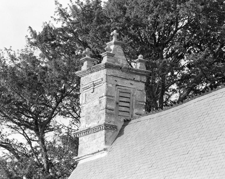 Au sommet de la verrière qui éclaire l'autel, un écu en forme de cartouche porte les armoiries d'alliance de deux familles : mi-parti au 1 : d'or à deux fasces de gueules (famille de Carné) ; au 2 : d'argent à trois quintefeuilles de gueules (famille non identifiée) ; on leur doit cette chapelle construite à la limite des 16e et 17e siècles.
