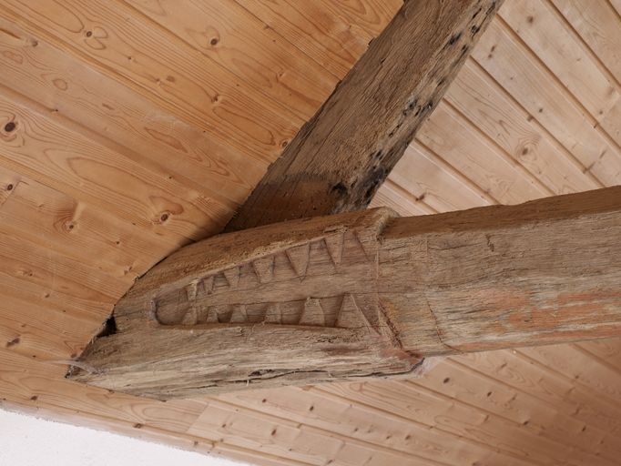 À l´intérieur, les murs sont enduits et le sol en partie dallé de schiste. La nef est éclairée, sur le mur est, par une baie en arc brisé, qui domine l´autel, et dont chaque piédroit porte un écu muet. Les extrémités de l´entrait sont sculptées en forme de gueules grimaçantes appelées engoulants.