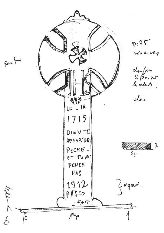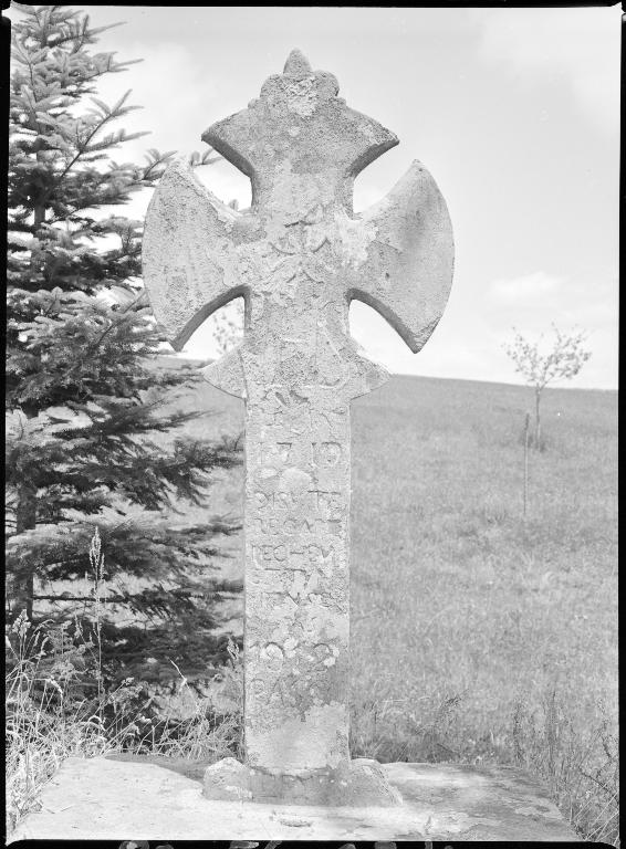 Croix de tracé circulaire très régulier, avec motif d’amortissement ; base de fût empattée ; chanfrein sur les deux faces de la croix. Croix très comparable à celle près de Lodineu, (même commune), construite à la même date : ces deux croix pourraient être du même auteur.