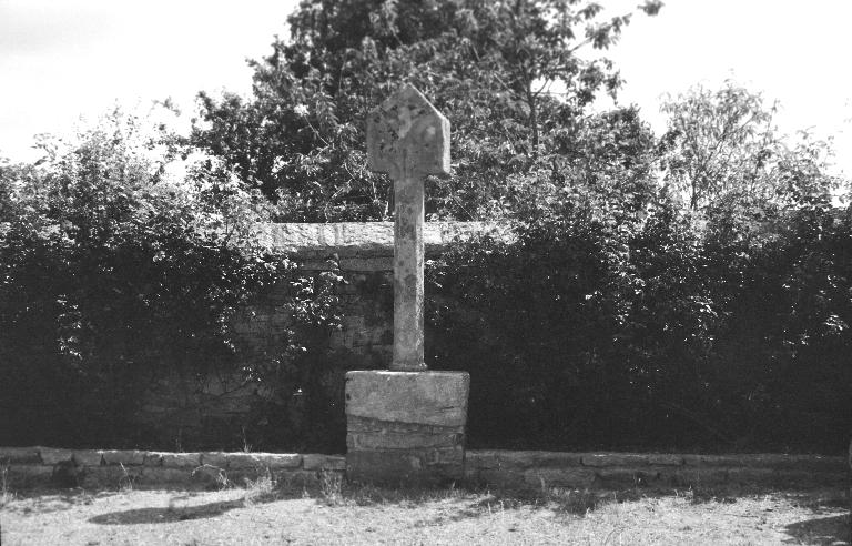 Croix-tableau à bâtière monolithe sur socle ; fût de section carrée chanfreiné. Décor en bas-relief sur une face : Christ en croix ; sur l'autre face : personnage non identifié.
