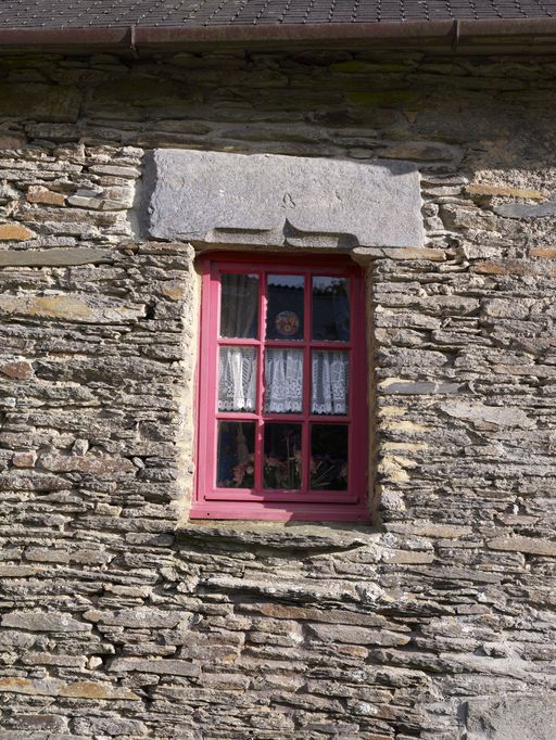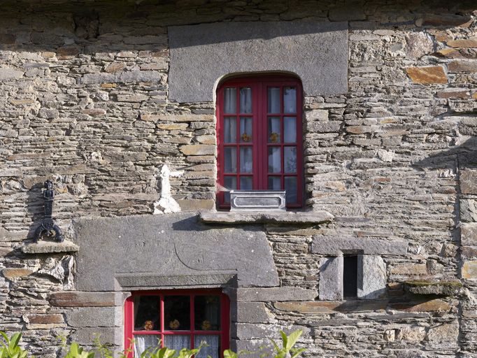 Maison du XVIIe siècle restaurée dans les années 2000 : réouverture des baies anciennes murées et remploi de linteaux de schiste ornés d'accolades.